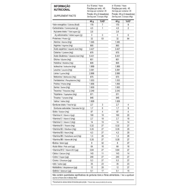 A linha Mais Performance fornece entre 31g e 32g de proteína por dose, além de um mix com 11 vitaminas e 6 minerais, sendo uma opção interessante para quem busca reforço proteico com suporte nutricional adicional. O produto está disponível nos sabores Baunilha, Chocolate e Morango nessa apresentação de 1,8kg.